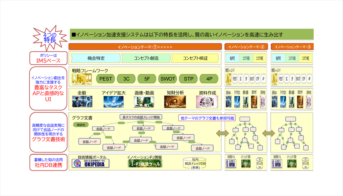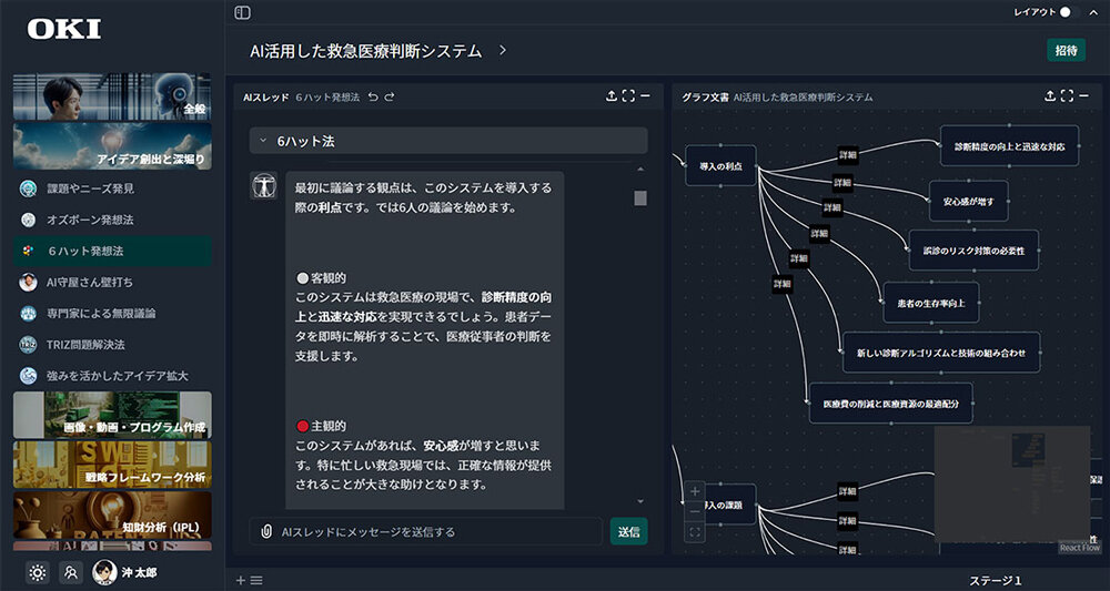 OKIでは社員一人一人によるイノベーションアイデアの創出を推進している(参考文献5)。社員がイノベーションアイデアを膨らませることを支援する目的でイノベーション加速支援システムを構築した。これは前述のグラフ文書RAGと対話によるグラフ文書の作成支援の技術を組み合わせて実現している(図5)。