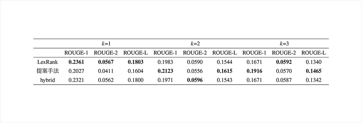 提案手法の有効性を確認するため、livedoorニュースの3行要約データセット(参考文献3)を用いて実験を行った。3行要約データセットはグラフ構造を持たないプレーンテキストであるため、本実験では文中に含まれる接続詞を基に、簡易的なグラフ文書を作成し、評価用データとして用いた。また、抽出する重要ノードの数はk={1,2,3}の3とおりとし、評価を行った。表1に実験結果を示す。評価指標として、ROUGE-{1,2,L}(参考文献4)を用いた。hybridは、LexRankと提案手法を組み合わせた手法である。実験の結果、k=2およびk=3のとき、すなわち、グラフ文書から複数の重要ノードを抽出する場合は提案手法が優れた性能を示すことを確認した(表1)。