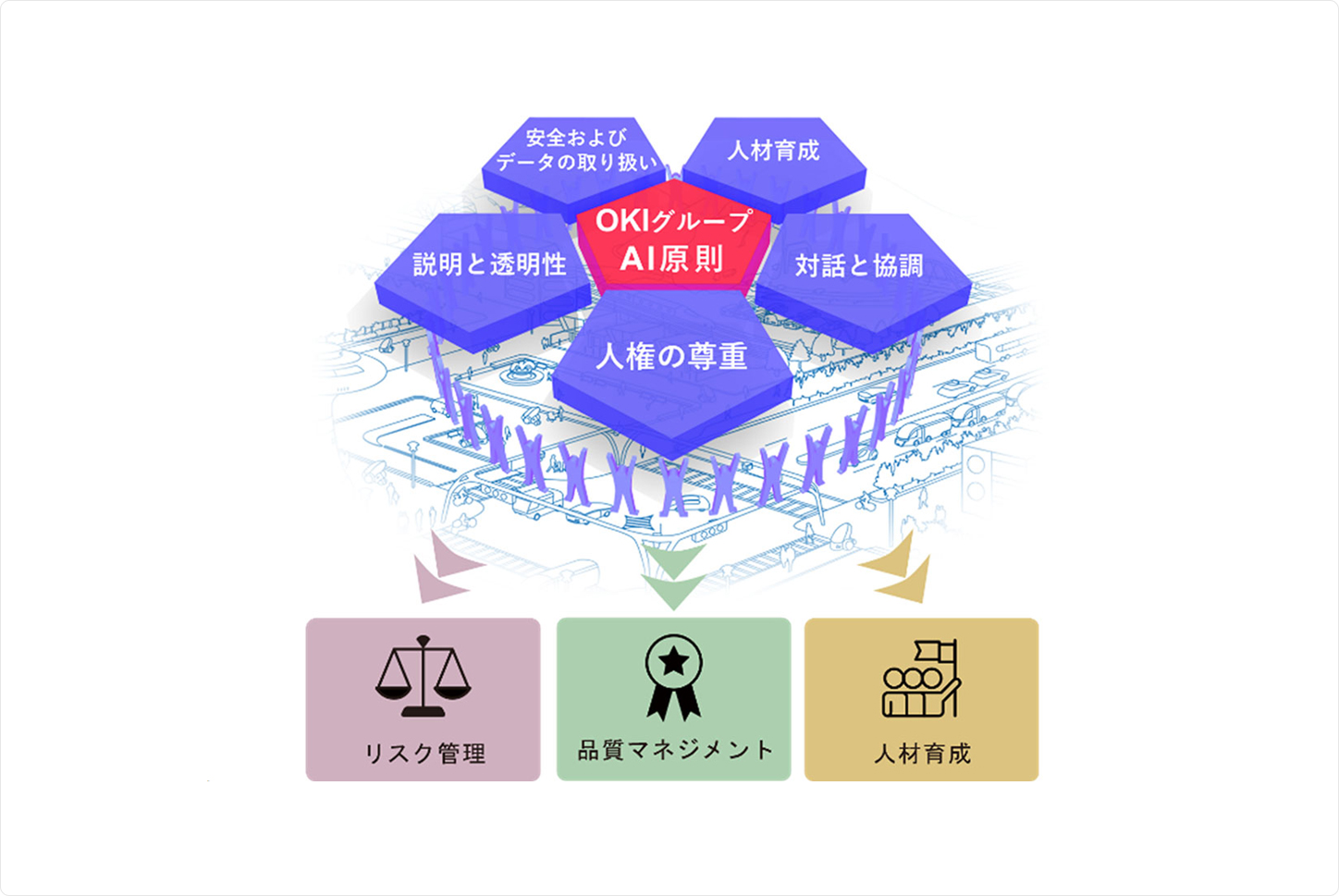 「OKI AI Chatシステム利用ガイドライン」の基本となる考え方は、2019年に制定した「OKIグループAI原則」(参考文献2)に基づいている。AI原則は、どのような価値観でOKIがAI商品などを提供していくのかを示しており、生成AIのガイドラインもこれに矛盾しないものとなっている。また、OKIではAI原則を運用する体制として、「リスク管理」「品質」「人材育成」の観点での全社ワーキング(WG)の活動を行っている(図2)。生成AIのガイドラインにおいてもAI原則策定に関わったWGメンバーおよび社外有識者により短期間で作成した。