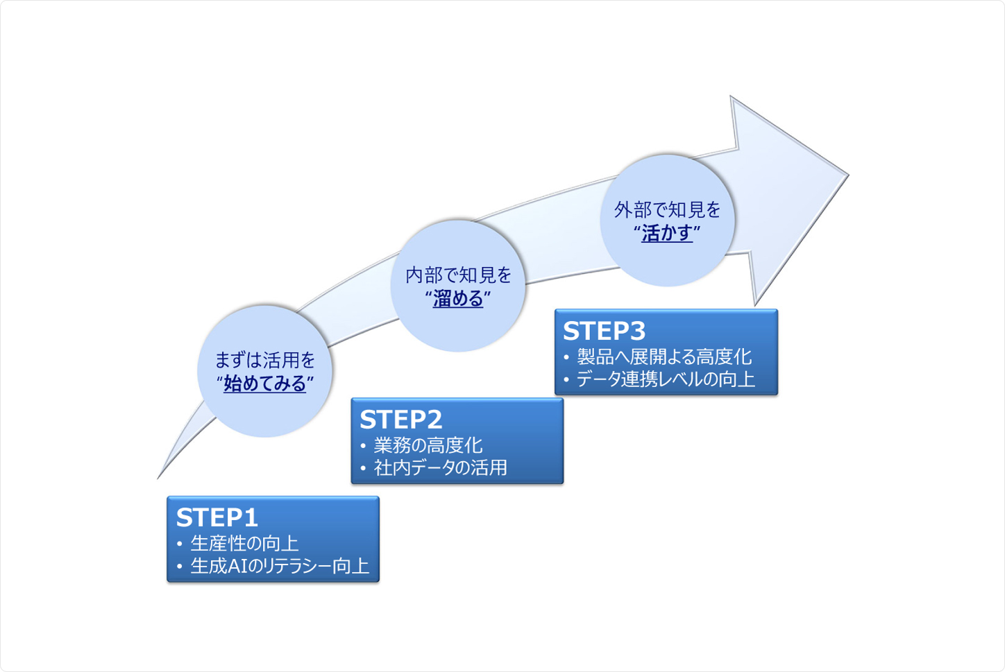ステップ1では、生成AIそのものを活用して生産性の向上を図るとともに、リテラシーおよび基本的な使い方の習得を目的にしている。