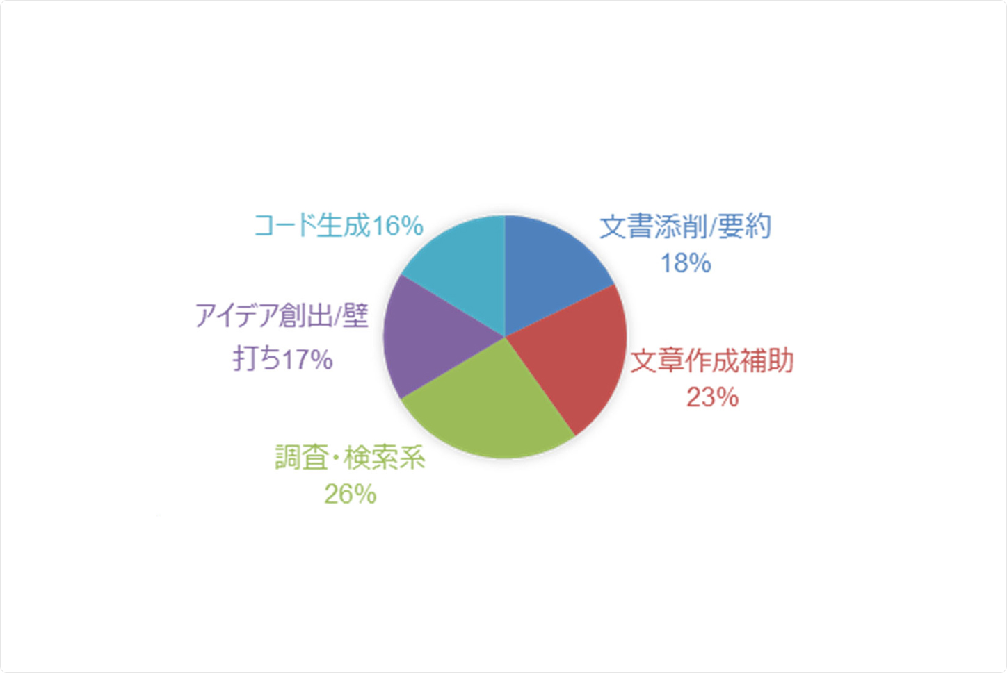 ステップ1の利用者にアンケートを取ったところ、特定のユースケースに偏ることなくさまざまな場面で利用されていることがわかる(図4)。これは生成AIの汎用性を示しており、色々なシーンでまず始めてみる必要性がわかる。