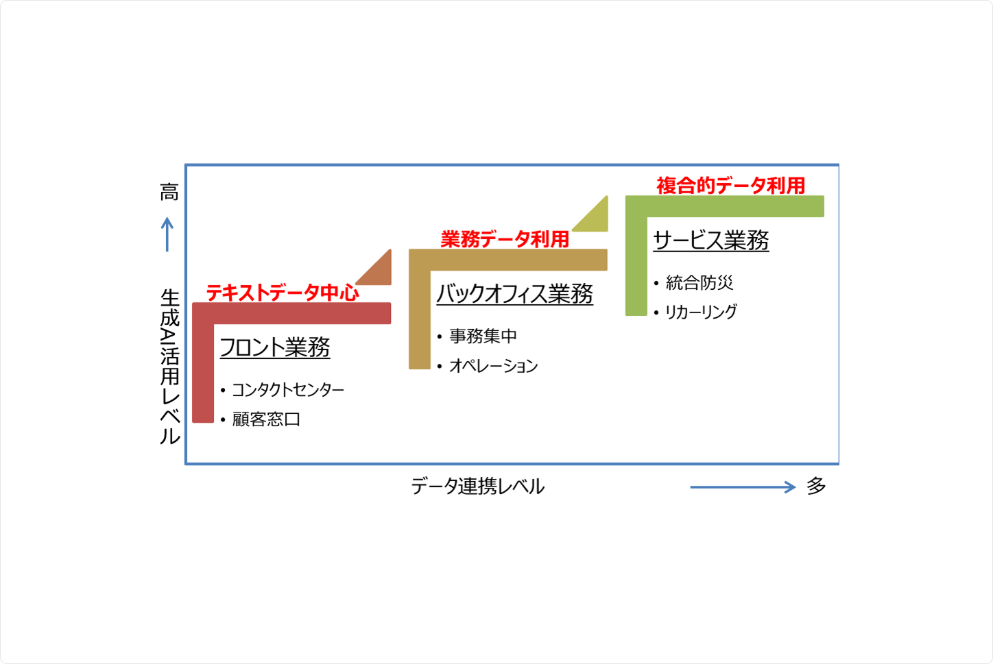 より高度な事業・サービスへの活用の際は、生成AIの技術だけでなく、データ連携も重要である。高度な業務の課題解決には複数の種類の業務データの活用と、それらのデータを連携させたうえで生成AIに入力する必要がある。生成AIを軸にデータ連携レベルを上げ、より付加価値を創出していく予定である(図5)。