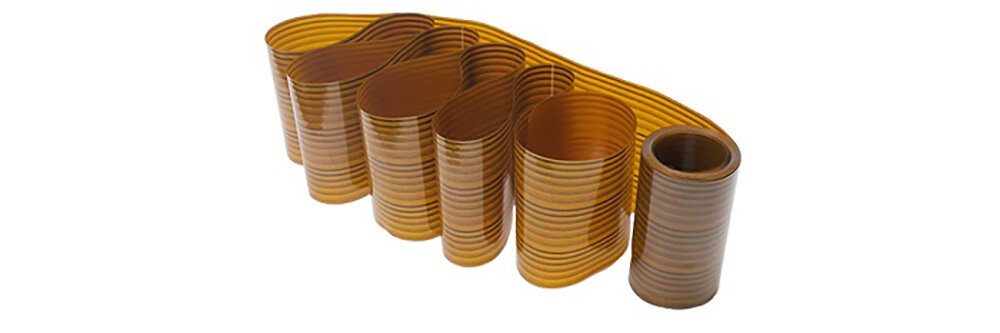 FPCは、絶縁性フィルムを材料に使った、薄く、軽く、柔らかく耐久性に優れた屈曲性のあるベースフィルム(放射線・高熱に強いポリイミドなど)と銅箔などの導電性金属を貼り合わせた基材に電気回路を形成した基板です。自在に曲げることができるため、機器内でのわずかな隙間や立体的な配置、繰り返して屈曲する可動部での配線が可能です。