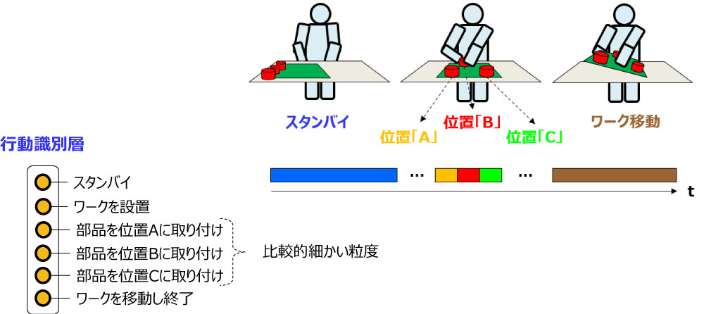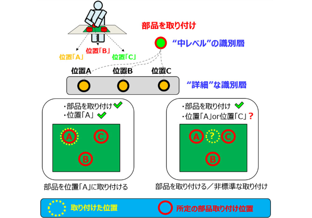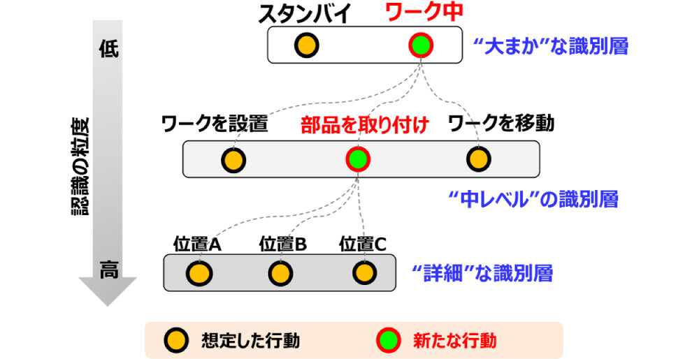 たとえば、フラットな識別では「部品を位置Cに取付け」が次の行動である「ワークを移動」などに間違えられることがあり得るが、階層的な識別ではA/Bだけと他の位置への誤識別しか発生しない。そのため、位置別の部品取付けのような詳細な判定が困難な場合は「部品取付け」という適切な推論結果を出力可能なメリットがある。さらに非標準的な作業やその他の行動の発見にもつながる(図3)。