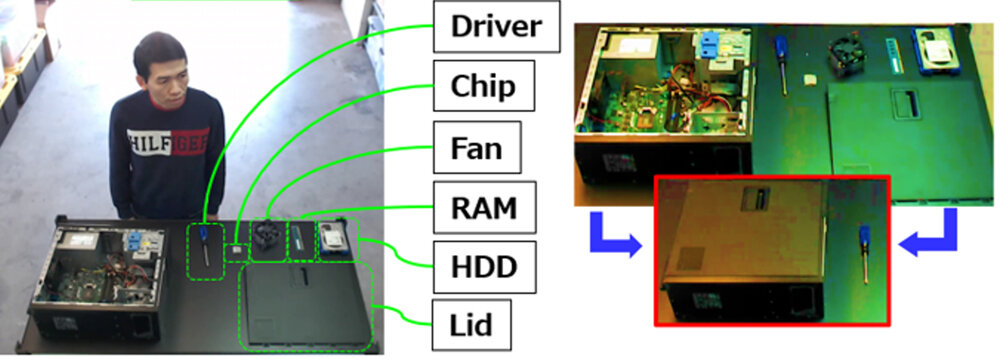 検証対象のデスクトップPC組立てタスクは、被験者が机の上に置いてあるファン、RAM、SSDなどの複数の部品を本体に取り付ける作業である(図4)。取り付ける際には部品によってドライバーとネジという道具も利用する。識別対象の行動は、「Pick_up_RAM/Install_RAM」(動作と対象物体)や「Tighten_screw_1/Tighten_screw_2」(動作、対象物体、位置)のように詳細な情報までアノテーションされている。