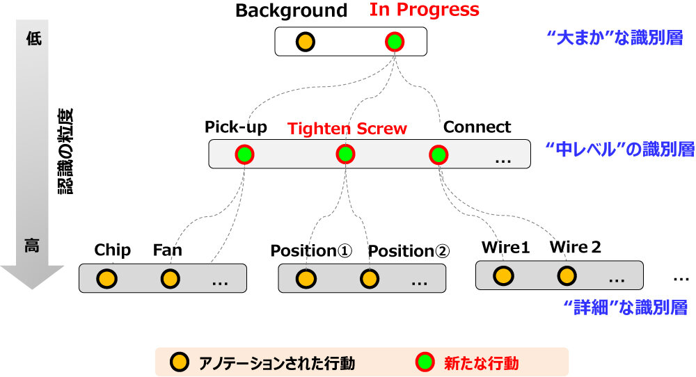 行動の粒度は、上位の階層で粗く、下位の階層で細かく分類する。人物の状態のみを表す(例:スタンバイ中)は、上位の階層に粗く、物体に対する同じ動作を示す(例:部品Xを取ると部品Yを取るなど)は下位の階層でより細かく分類する。具体的な動作がどのように行われるかは、さらに下位の階層で詳細なグループにする(例:ネジを位置Aに締めるとネジを位置Bに締める)。また、この仕組みでは、アノテーションされた行動の粒度が細かい場合はより上位で粗い階層に属する代表的な行動クラス(例:作業中やネジを締めるなど)を新たに設ける工夫が必要となる。