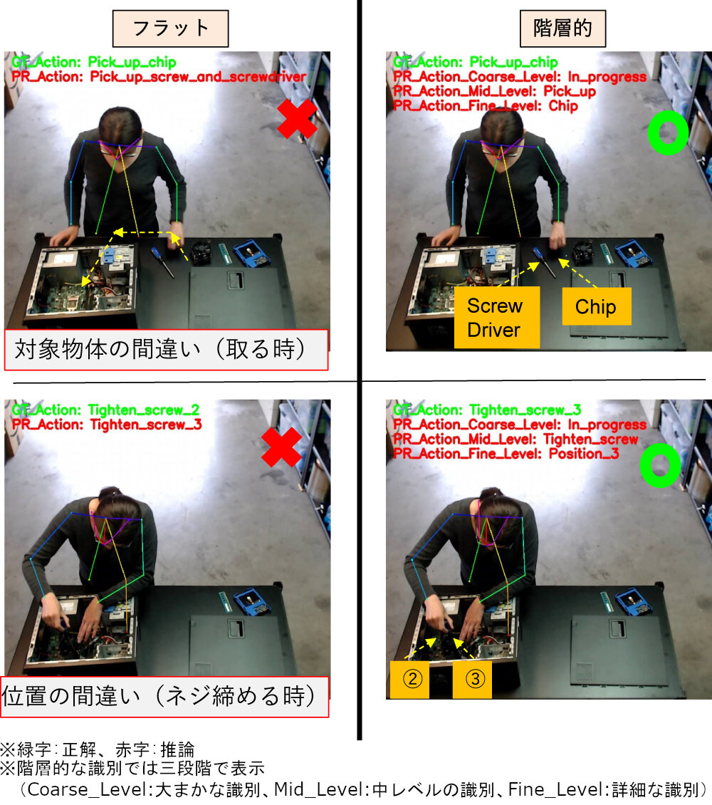 日常生活にある「ジャンプする」、「走る」、「スポーツをする」などの背景も人物の動きもかなり異なるという粗い粒度の行動を識別するには、行動の数を分類するタスクとして扱うことができる。一方、製造現場のように一連に起きる「スタンバイ」、「テーブルに脚を取り付ける」、「脚を回す」などのテーブルを組み立てる際の行動は識別レベルを示す粒度が異なったり境界線が曖昧だったりするためフラットな学習が難しくお互いの誤識別も発生する。このように、対象の行動数が多く連続して行動が起きると境界線が曖昧になるため、従来のように全行動を同様にフラットに学習・識別することは困難になるという課題がある。