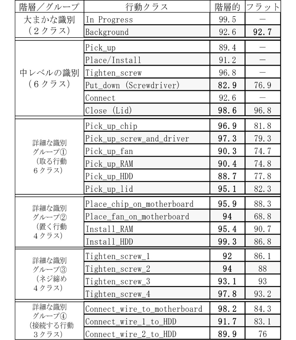 本稿では、行動認識性能を向上させるための一つの工夫である階層的な識別技術を紹介する。また、有効性を確認するために、製造分野を想定したデスクトップPCを組み立てるデータセット(参考文献3)に対する検証結果も述べる。
