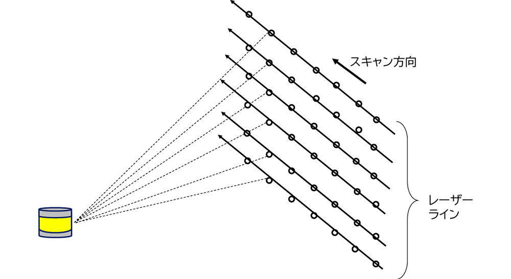 LiDARは、2次元上に複数のレーザーを同時に照射し、3次元空間上の物体を高精度にスキャン(計測)する装置である。本システムでは、ホーム端周辺の広いエリアをカバーするために、図2に示すような水平方向(Horizontal)と垂直方向(Vertical)に一定間隔でレーザーを照射する水平視野角360°の回転式LiDARを採用している。