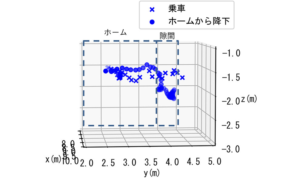 3次元空間で隙間への転落を検知するためには、センチオーダーで人を計測(検知)することが必要である。図8に当社で開発した3次元人計測技術で、乗車する人と隙間に降りた人(試験的に実施)の3次元位置を計測した結果を示す。この図に示すとおり、乗車する人と隙間に降りた人では、隙間空間で計測された位置が異なることが分かる。