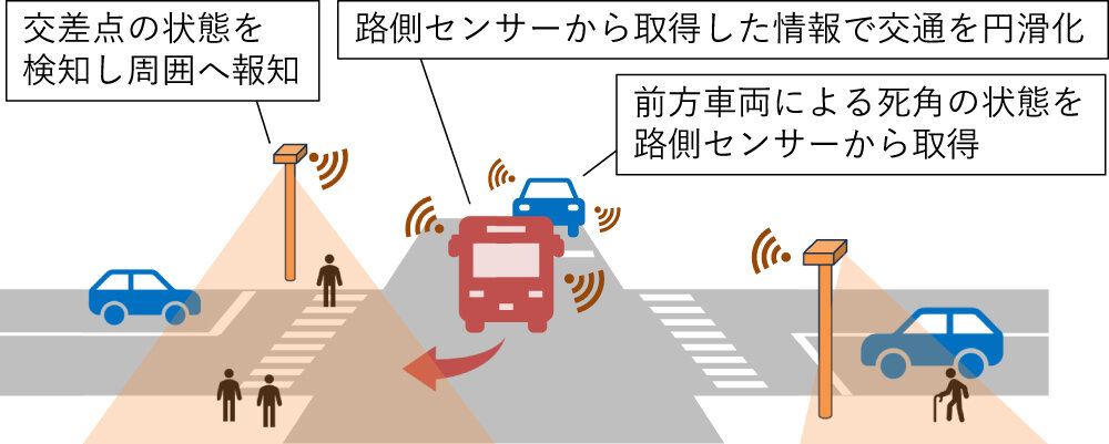 河川の広範囲を同時に観測し、リアルタイムの流量計測を可能にするという従来技術では困難な目標を達成するために、OKIは交通分野での活用が進むFMCW方式のレーダー技術に着目した。FMCWレーダーは、広範囲に電波を照射し、複数の物体からの反射波を受信・解析することにより、各物体の位置および速度情報を同時に高精度で取得可能である。従来、本技術は車両や歩行者の検知・分類・移動追跡を主な目的として利用されてきた。たとえば、交差点に路側センサーとして設置することで、交差点へ侵入する車両に対し、その死角にいる歩行者の存在を報知し、交通の円滑化を支援するなどの活用が期待される(図1)。