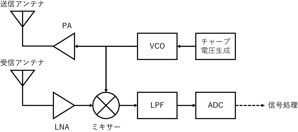 - 周波数が時間とともに変化するチャープ信号を利用することで、簡単な回路構成ながらターゲットの距離と速度を同時計測できる技術。自動運転など交通分野での活用が進む。
