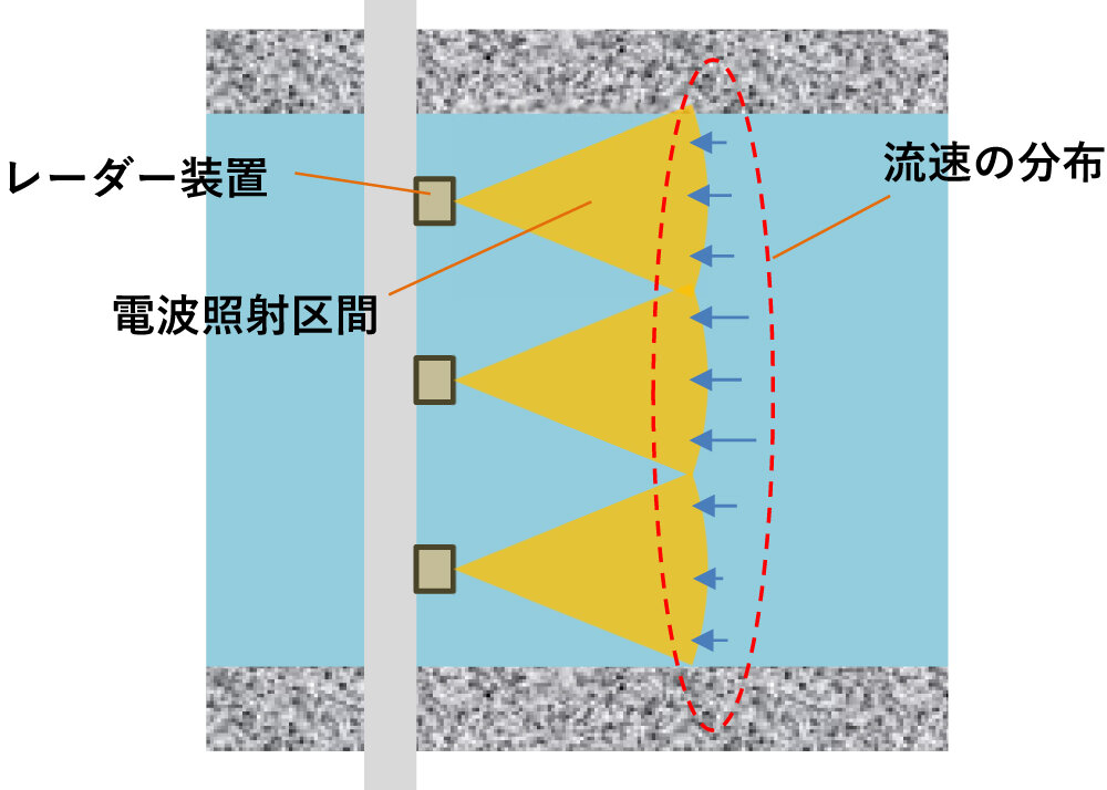 従来、河川の流速を非接触に計測するにはミリ波レーダーを用いる電波式流速計とカメラ画像を用いる画像式流速計が利用されてきた。電波式流速計ではドップラー方式が利用される。これは、機器が発射した電波が水面の波に衝突して反射し、そのドップラーシフトによる周波数変化量から流速を求めるものである。本方式は一般に、計測箇所の位置を分離識別できないため、水面上の複数箇所からの反射を同時に検出した場合には、それらを区別できず計測誤差の要因となる。これを低減するため、アンテナの指向性を高めて、水面の限定的な一点を対象に計測する。従って、本方式の流速計は、水面の局所的な速度変化や異常のリアルタイム計測で有用であるが、原則として一点観測となるため河川の流れ全体を正確に把握するには限界がある。