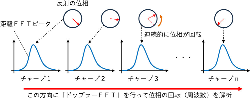 ターゲットの速度計測は、等間隔で連続的に送信した複数チャープからなるフレーム単位でのデータ解析により実現される。移動する物標からの反射波は、チャープごとにわずかに異なる位相を持つ。これを時系列で並べ、二次元目のFFT(ドップラーFFT)を実行すれば、物標の移動速度に応じて生じる位相変化量が周波数成分(ドップラー周波数)として現れる(図6)。移動速度が速いほど、チャープ間の位相変化が大きくなり、高いドップラー周波数成分として抽出される。この処理によって、等距離に複数のターゲットが存在していても、異なる速度を持っていればそれぞれ個別に分離・識別できる。