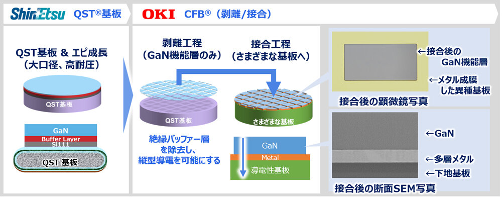 そこでOKIは、図2に示すようにCFB技術を活用し、QST基板上で成長したGaN機能層のみを剥離し、絶縁膜を除去したうえでSi基板上のメタル層に直接接合する新たなプロセスを開発した。断面SEM(電子顕微鏡)観察や600℃での熱処理テストにおいても、GaN機能層とメタル層の間に空隙のない高い接合品質が確認された。さらに、接合界面を介した電気特性を評価した結果、良好な縦型導通特性が得られ、GaNパワーデバイスにおける縦型導通の実現可能性を示すことに成功した。