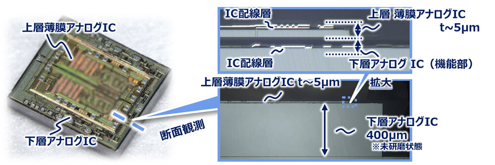 そこでOKIは、CFB技術を日清紡マイクロデバイスのアナログICに適用し、アナログICの薄膜化と別基板への集積プロセスを開発した。アナログICは多数のトランジスタを集積した高度なデバイスであり、動作特性を損なわずにSi基板から機能層を剥離し、他基板上へ高信頼に接合することを、CFB技術によって実現した(参考文献3)。図3は積層したチップとその断面である。