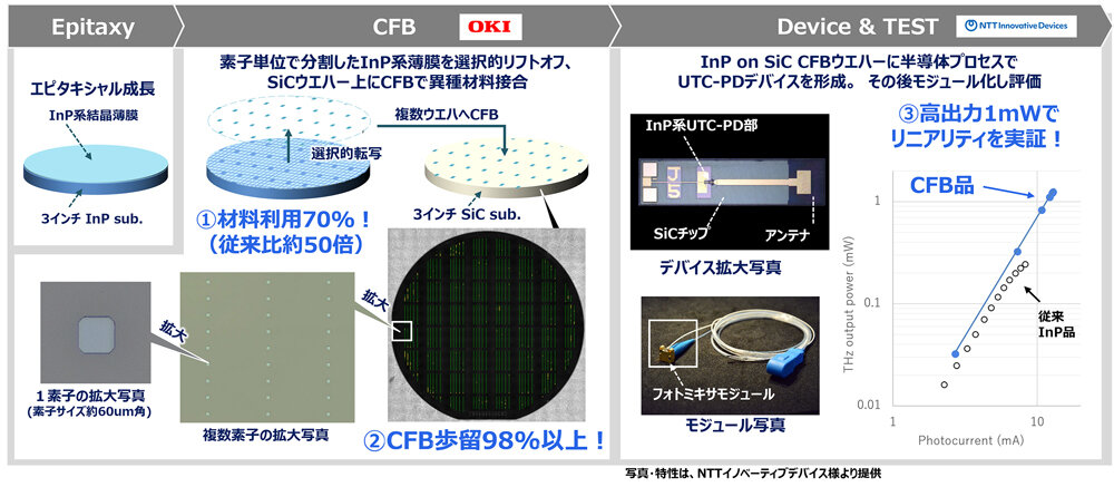 これらの課題に対し、OKIはCFB技術を活用することで解決を進めている。その一例がNTTイノベーティブデバイス株式会社との共創である。NTTイノベーティブデバイスでは、大阪大学、九州大学、東京大学と共同で、次世代通信での活用が期待されるUTC-PD(Uni-Traveling Carrier Photodiode)テラヘルツデバイスの高出力化を目指し、InP基板よりも熱伝導率が約7倍高いSiC基板上に異種材料接合を行い、放熱特性を大幅に改善し、1mWを超える出力飽和電力を達成した高出力UTC-PDの開発に成功した(注3)。しかし、従来の接合技術ではInP系エピタキシャル材料の利用効率が約1%と低く、接合歩留まりも約50%以下にとどまるなど量産面での課題があった。