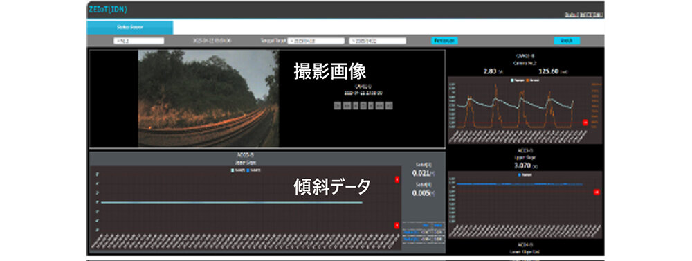 さらにクラウド上にデータを収集し、インフラ管理者が各自のパソコンやスマートフォンのブラウザーから傾斜データのグラフや画像を参照できる環境を提供し、しきい値設定による警報通知も可能とした。モニタリング画面の例を図3に示す。