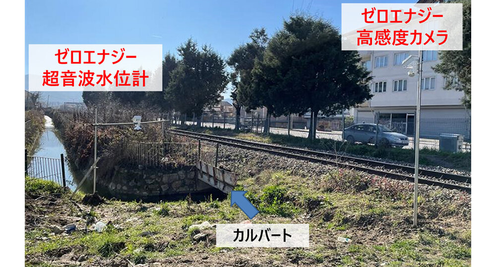 河川の増水によりカルバートから水が溢れて線路が浸水する危険のある箇所で実証を行った。ゼロエナジー超音波水位計をカルバートの近傍に設置し、豪雨時の水位変化を遠隔監視し、ゼロエナジー高感度カメラの画像と組み合わせることで、現場に赴かずに安全運行判断を支援できることを確認した。現場における機器の設置場所を図6に示す。