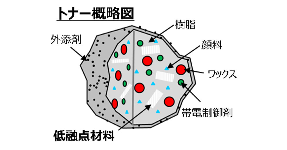 トナーの低融点化は、新たに低融点材料を採用することで実現した。この低融点材料は、従来のカラートナーで採用実績のあったものを改良し、モノクロトナー用に最適化したことで、OKIモノクロプリンター向けトナーとして初めての採用に成功した。