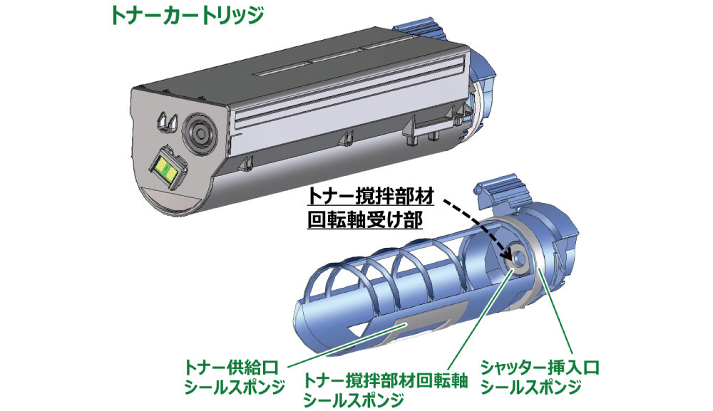 軸受可動部の構造や材料を見直し、さらに、トナー漏れを防ぐシール部のスポンジ材料を再選定したことで、従来比約5倍の耐久性能を実現した。これにより複数回のリサイクルが可能となり、環境負荷低減に貢献する(図3)。