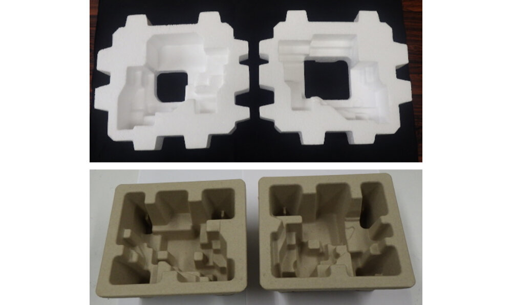 パルプモールドは水で溶かした再生紙繊維を金型で成形するもので、従来のビーズ法発泡スチロール(expanded polystyrene、EPS)に比べて環境負荷の低減に貢献する。B433dn/B513dnではEPS同等の緩衝性能を目指し、形状の試行錯誤を重ねることで、積載効率を変えることなく従来同等の緩衝性能を実現した(写真6)。