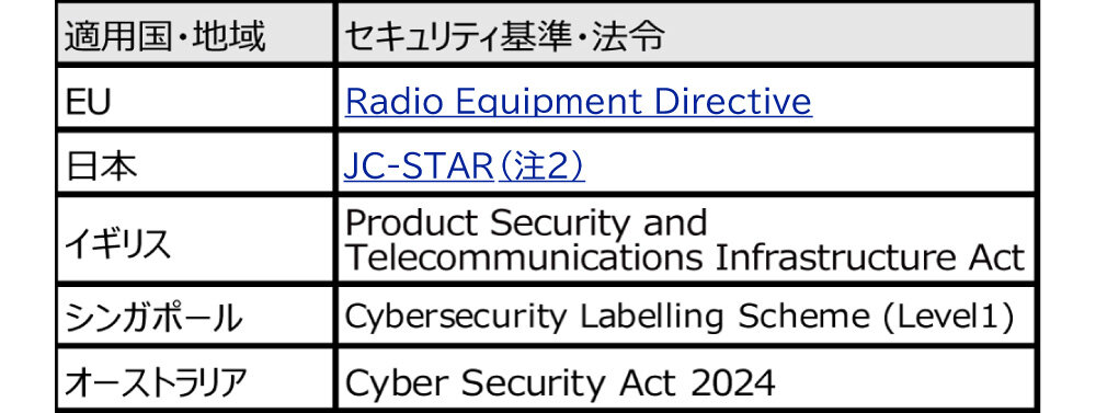 グローバル市場を見据え、各国・地域で求められるセキュリティ基準や法令の対応に取り組んだ(表2)。