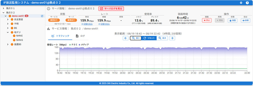 図3はIP放送監視サーバーの画面例である。左側には設置された拠点一覧と拠点毎のサーバーのリストが表示され、サーバーを選択すると受信しているパケットのビットレートや発生したエラーログなどが表示される。時系列のグラフがリアルタイムで更新され、配信状況の変化を容易に確認できる。さらに、サーバーで受信しているチャンネル毎の各種情報の表示も可能である。また、ネットワークの中継拠点にIP放送監視サーバーを設置することで、拠点間のパケットの遅延や揺らぎなどの伝送区間ごとの伝送品質を確認できる。