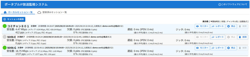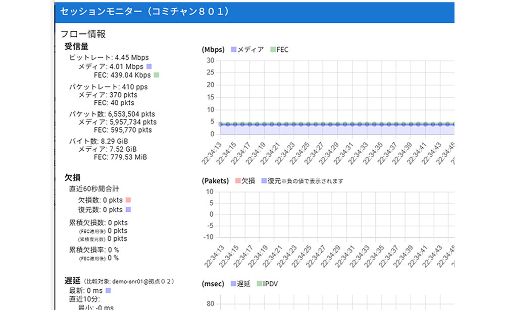 図4はポータブル監視サーバーの画面例である。運用者が測定対象となる拠点のIP放送監視サーバーを選択し、測定するチャンネルを選択するとセッションが開始され、ビットレート、遅延、揺らぎ(ジッタ)の測定値がリアルタイムで表示される。また、図5に示すように各セッションの直近の状況のグラフがリアルタイムで更新され、画面左側にはIP放送品質測定で規定された各測定項目の結果が表示される。各セッションの品質測定で表示される主な項目は、