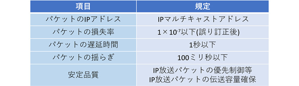 従来はRF(Radio Frequency)方式で伝送していた放送をIP化するには、IPマルチキャストを利用した効率的な伝送と、安定した品質で放送を届けるIPネットワークの信頼性が重要となる。一般社団法人日本ケーブルラボでは地上デジタル放送、BSデジタル放送、高度BSデジタル放送の再放送と、専門チャンネル・コミュニティチャンネルの自主放送をIPマルチキャストで配信するIP放送運用仕様を制定した(参考文献2)。また、総務省では有線一般放送の品質に関する省令を改正しIP放送に関する技術基準を追加した(参考文献3)。