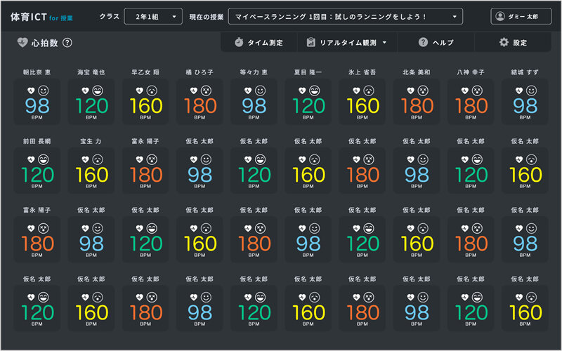 心拍数や消費カロリーなどの運動情報をリアルタイムにモニタリングすることができる体育授業向けICTソリューションです。生徒の腕にリストバンド型のデバイスを付けることで運動情報を取得し、生徒および教員がタブレット端末でリアルタイムにモニタリングすることができます。教員は、生徒の運動負荷状態や体調を一覧管理しながら、安全な授業が可能となり、教員の負担軽減を実現できます。また生徒は、自分の運動状態を確認することで、学習の振り返りもできます。本展では、ソリューション紹介だけでなく、ICTを活用した「運動の見える化」を実現できる新しい体育授業としてもアピールしました。