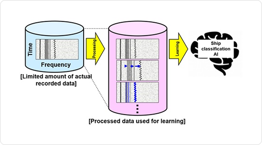 OKI conducted verification using ship sound data it gathered. This time, the system achieved classification results with an accuracy of 90% or better, based on a deep learning model prepared using approximately four hours of ship sound data. Deep learning models typically require large amounts of learning data to accurately identify sound types. However, the amount of publicly available underwater sound data is limited, and preparing various ship sound information in advance poses significant challenges in terms of time and cost. Thus, OKI applied certain processing techniques to enable classification through the use of only small amounts of learning data. The challenges mentioned above were solved by data augmentation, which artificially creates variations for actual ship sound data, and semi-supervised learning, which trains the model using ship sound information from partial data. As a result, the system achieved an accuracy rate of 90% or better, even with small amounts of learning data.