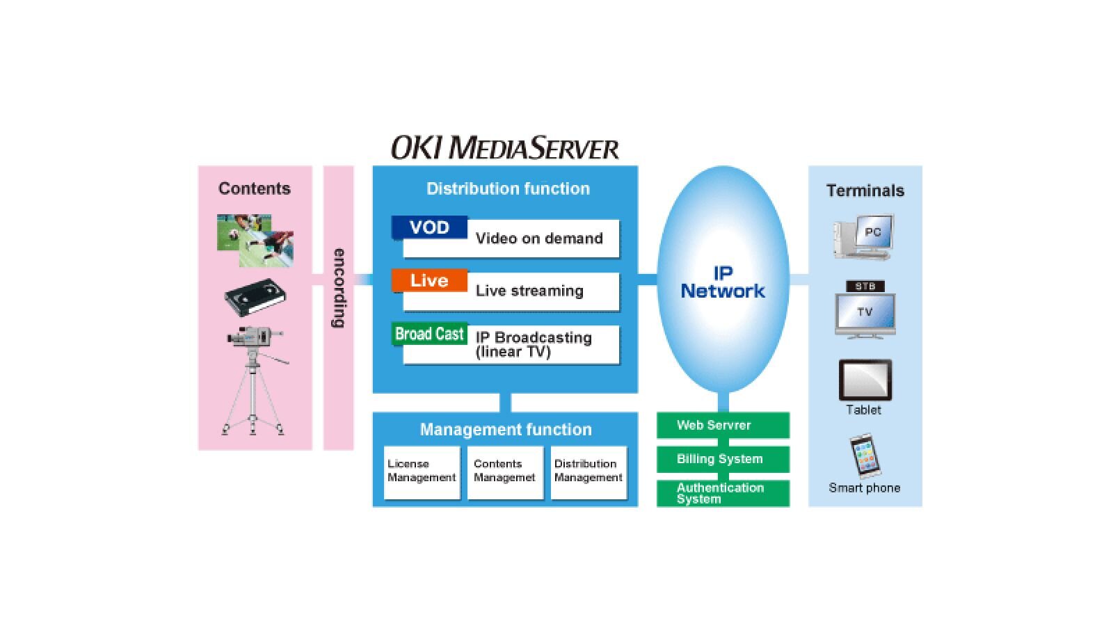 OKI MediaServer can be used for several IPTV services such as VOD(Video-on-Demand), live streaming, IP broadcasting (linear TV) and their combined services.
