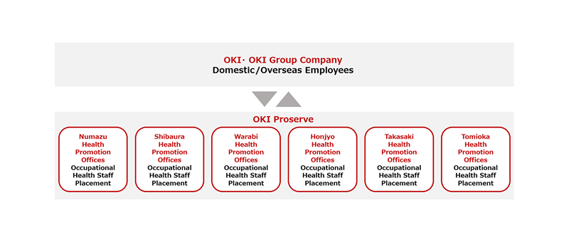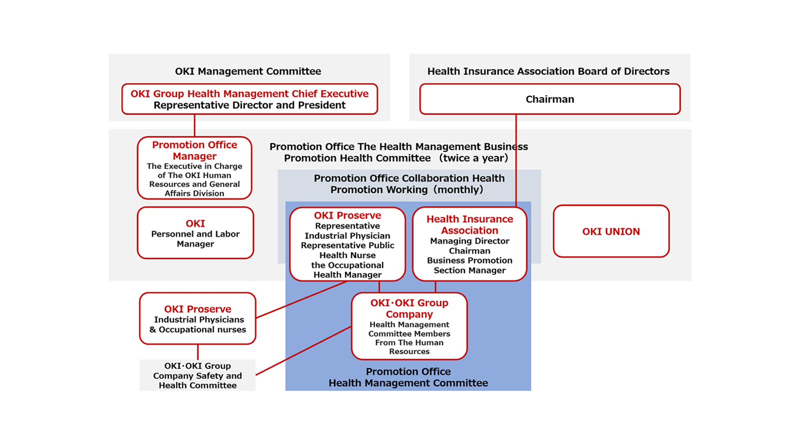 The executive in charge of the OKI Human Resources and General Affairs Division is responsible for selecting Health Management Committee members from the Human Resources and General Affairs Divisions of each Group company as well as for selecting a representative industrial physician and representative public health nurse from among the occupational health staff. We promote health management in collaboration with the OKI Union and OKI Health Insurance Society, including linkage with in-house diversity & inclusion promotion as well as OKI well-being promotion.
