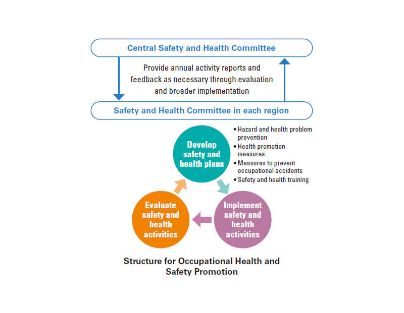 The OKI Group positions the creation of a comfortable work environment where employees can work in a safe and healthy manner as an important foundation for its corporate activities. In each region, OKI established "Safety and Health Committees" comprised of management and labor union members to develop safety and health systems. Management and labor union members work together to systematically advance measures for preventing hazards and health problems and promoting the health of employees. The Central Safety and Health Committee meets once a year to evaluate the activities of each region and encourage their broader implementation.