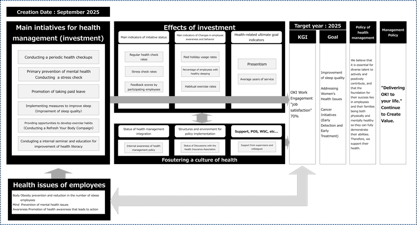 OKI participates in the "Health & Productivity Management Alliance," which was established on June 30, 2023. The Health & Productivity Management Alliance is an organization consisting of 148 companies and organizations (as of June 30) that conduct activities in line with the alliance’s vision of "revitalizing Japanese companies and achieving sustainable health insurance societies though employee health." Through the Health & Productivity Management Alliance, we will cooperate with our health insurance society to promote collaborative health in order to achieve data-driven issue identification and solution execution as well as the evaluation of various measures. In addition, by steadily implementing a PDCA cycle based on a data health plan, we will co-create solutions aimed at health-management shaping and result generation, and we will then implement these solutions throughout the industrial world.