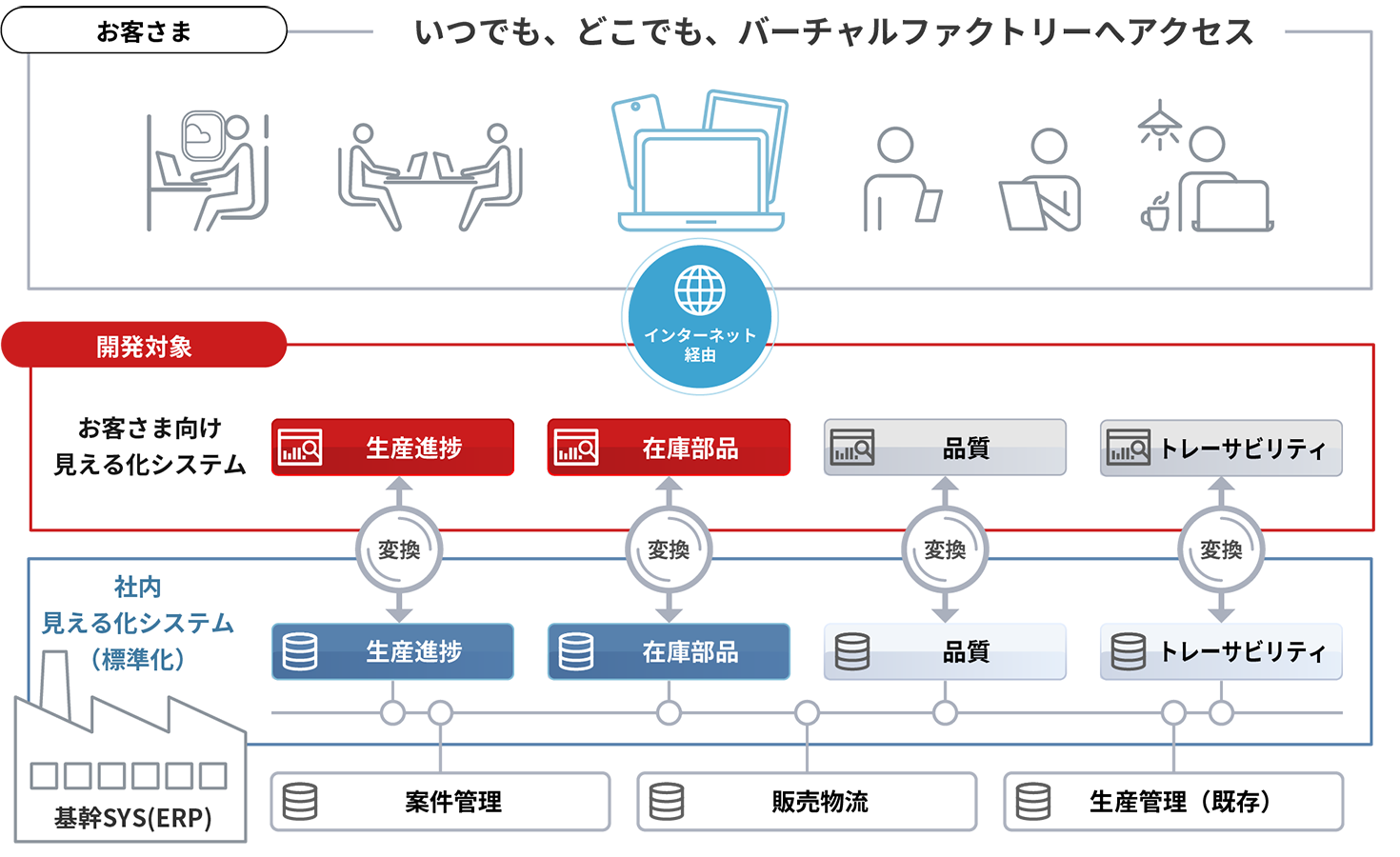 OKIはお客さまのバーチャルファクトリーとして、生産進捗や在庫管理など、モノづくり情報をすべてインターネット経由で「⾒える化」します。