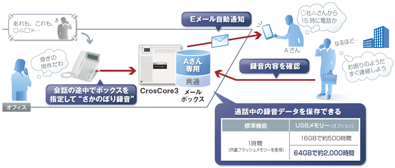 - 外線で相手との会話を簡単に録音し、Eメールで通知できますので、メモを取らずに要件を担当者に伝えられます。USBメモリーで最大2,000時間まで録音できます。