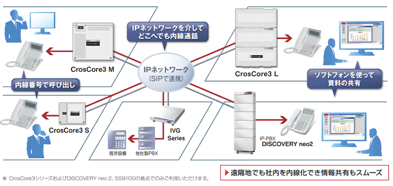 - CrosCore3シリーズ間はもとより、大規模オフィス向けの「DISCOVERY neo2」や「SS9100」ともIPネットワークを介して連携し、内線通話ができます。