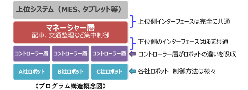 最大の特徴は複数メーカーのAMRを一元的に制御できることである。プログラムは、中核となるマネージャー層が配車や交通整理などの集中制御を行い、ロボットごとにインスタンス化されたコントローラー層がロボットの違いを吸収する構造となっている。コントローラー層は共通クラスであり、インスタンス化される時に各ロボットに適応した動作をするように設計されている(図1)。
