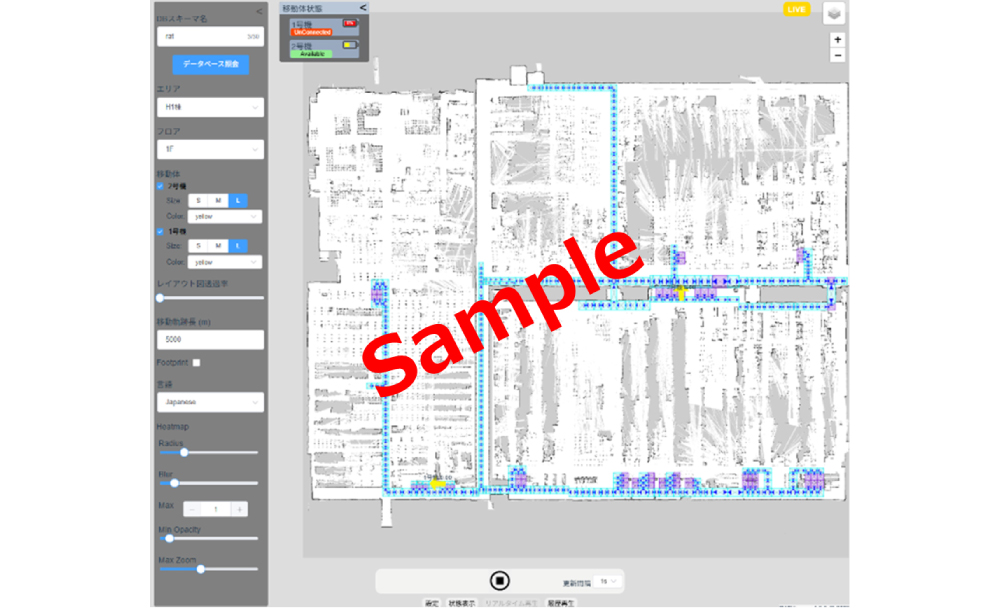 運行状況確認アプリケーションも同じくWebアプリケーションで、マップ上の現在位置や各ロボットのステータス、軌跡表示や滞留状況確認のためのヒートマップ表示、ネットワーク強度情報などをWebブラウザーで表示する事が可能となっている(図4)。本アプリケーションには、過去情報のトレース機能も有しており、開始終了日時を設定することで当該期間の走行状態、ステータス状態を再現することができる。これによって不具合発生時の経緯の確認ができ、迅速なトラブルシューティングを可能にしている。また、過去情報も現在情報と同様に滞留状況や軌跡を表示することができ、レイアウト検討の材料として活用することも可能となっている。
