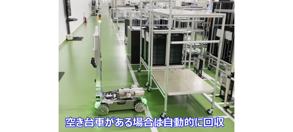 搬送動作の指示方法としては、作業者による入力(ボタン押下)による搬送以外にも、外部システム連携で自動的に搬送指示が入力されることは前述のとおりである。これ以外にもフィールドセンシングを行うことで、特定の場所に台車を置いたことをトリガーに搬送を開始するという仕組みを実装している。これにより作業者は完成品などを積んだ台車を所定の場所に置くだけで自動的にリクエストが出され、搬送を開始する。また、作業者がリクエストを出す時に、遠隔からでは搬送先が空いているかどうかわからず、搬送をして良いか判断ができない場合がある。このような場合もフィールドセンシングを組み合わせることで、搬送先が空いたら搬送を開始するという動作も可能となっている。加えて、搬送先に複数の置き場所を設けてグループ化し、各場所をセンシングすることで空き場所を自動探索する機能も実装した。作業者はグループを選んで搬送要求をすれば、自動的に空いている場所へ搬送されることが可能となっている(写真3)。