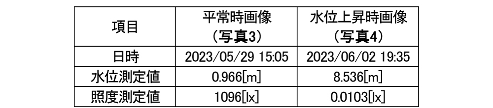 ZEカメラで撮影した画像を写真3および写真4に示す。また写真3および写真4の撮影日時、水位測定値および照度測定値を表2に示す。昼間と夜間とを問わず、雨水貯留池の貯水の度合いを確認できる。特に写真4では夜間の撮影にもかかわらず、水位が大きく上昇している様子を視認できる。また、ZEカメラの明るさの仕様値(0.01[lx])と同等の照度環境(0.0103[lx])での撮影でも十分な輝度の画像を取得できている。これらの結果から、ZEカメラは一定以上の照度があれば天候にかかわらず十分な輝度の画像を取得でき、画像によるリモートでの状態監視が可能であるといえる。