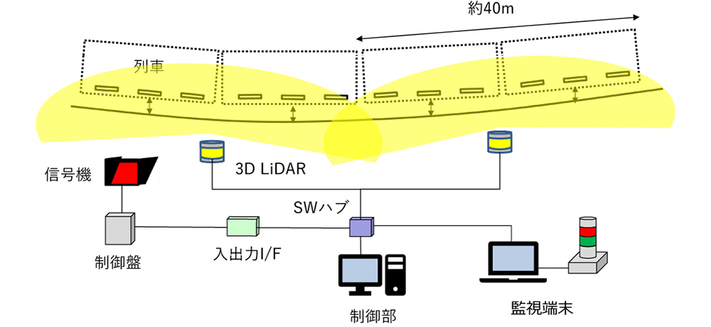 本システムは、主に、ホーム上に設置されたLiDARから得られる3次元点群データを用いて転落判定処理などを実行するサーバー、および、判定結果の表示などを行う装置で構成される(図1)。本システムでは、LiDAR1台で2車両分(約40m)に相当するホーム端周辺エリアの人を検知対象としている。各装置はネットワークケーブルで接続されているため、遠隔地に設置されたサーバーで処理することや、異常発生を駅ホームの信号機だけではなく遠隔地の監視端末などにも通知することも可能である。