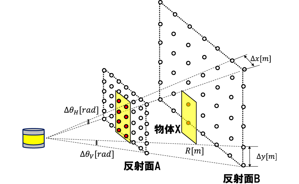図2のように一定間隔でレーザーを照射するタイプのLiDARでは、式(1)に示すとおり、計測物までの距離が遠くなるほど分解能が低下する(図3)。そのため、LiDARを用いて物体の有無を判別するためには、距離分解能と検知物体のサイズを考慮して、検知可能な距離を設計する必要がある。