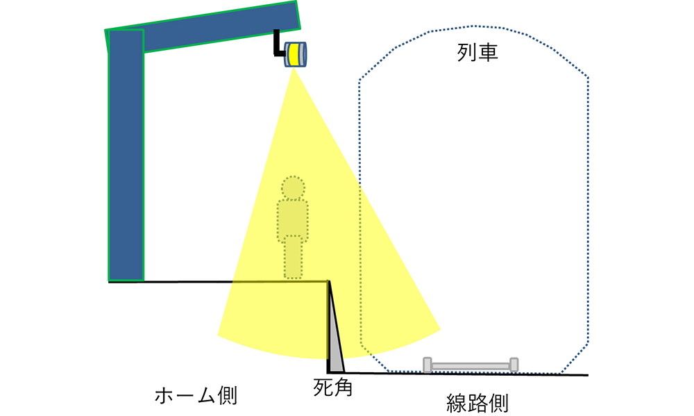 図4に示すように、ホームの屋根などにセンサーを設置すると、ホーム側と線路側の両エリアを同時にセンシングすることが可能となる。ただし、ホーム端からLiDARまでの距離に依存した死角が、ホーム下に生じることに注意する(参考文献5)。