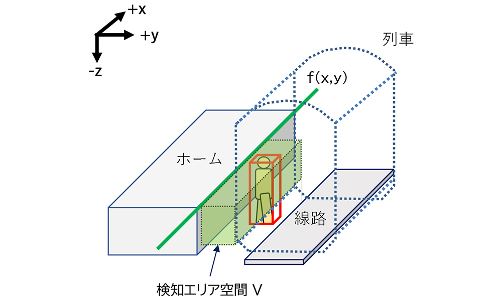 当社では、さまざまな形状のホームで適用可能な転落検知システムを実現するために、RTK-GNSS測位などの測量装置を活用し、LiDAR座標系にマッピングすることでホーム端の全体形状を高精度に推定する技術を研究開発した。図6に、隙間転落検知を利用する際のLiDAR座標系と検知エリア空間との関係を示す。LiDARのx、y、z軸をそれぞれホーム沿い、線路向き、ホーム高の方向にとり、ホーム端形状を関数f(x,y)で表し、zとなす空間をVとして検知エリア空間を定義する。ここでは、ホーム端形状をRTK-GNSS測位データを用いて推定する方法と当社のLiDAR人位置計測技術の精度について説明する。