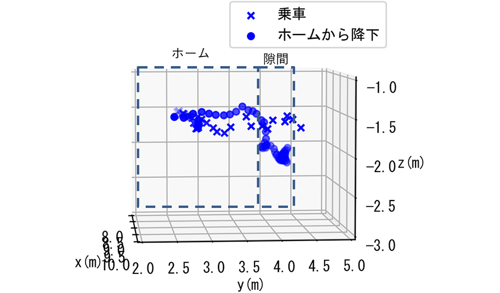 3次元空間で隙間への転落を検知するためには、センチオーダーで人を計測(検知)することが必要である。図8に当社で開発した3次元人計測技術で、乗車する人と隙間に降りた人(試験的に実施)の3次元位置を計測した結果を示す。この図に示すとおり、乗車する人と隙間に降りた人では、隙間空間で計測された位置が異なることが分かる。