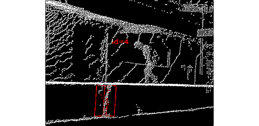 図10に、LiDAR点群から子ども人形を検知した結果を示す。評価した位置での隙間は、20cm程度であったが、子ども人形(検知枠内の点群)だけを良好に検出していることが分かる。さらに、検知エリア空間を曲線空間でホーム下のみに定義したことにより、運行時間帯での誤検知を非常に低く抑えることができることも確認した。