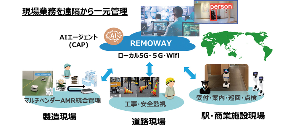 人口減少と労働力不足という社会課題に対し、エッジプラットフォーム「REMOWAY® (注4)」を核とした遠隔運用ソリューションの社会実装に向けた価値検証をお客様および共創パートナーとともに促進している。鉄道会社とは駅構内の運用管理、道路運用会社とは作業員の安全管理、通信事業者とは製造現場のロボット連携をテーマとした実証実験を繰り返している。人とロボットが協働する上で必要な遠隔統合運用環境を実現するための共通モジュール、API連携、AIエージェント(CAP(注5))を段階的に提供する。REMOWAYは屋内外問わずエッジ端末を接続する通信技術により、各現場を見える化し、データの解析および自動制御を行うプラットフォームの実現を、各領域の共創パートナーと連携して推進している(図1)。また、YumeProチャレンジをトリガーとし、海外拠点におけるREMOWAYを活用したビジネスアイデアのマーケティング活動も開始している。